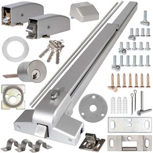 This panic bar is surface mounted. The panic bar will be placed on the rear face of the door. The rods lead to latches at the side of the door frame.This bar is specially designed for security and also latches on the top and bottom of the door frame. On the top will be a surface strike and on the bottom of the door a floor keeper that will allow a drop pin to go into the floor through a hole in the center of the floor keeper. The strike goes on the door frame behind the door, not on the inside of the frame where you may have previously had a handle. On the door if you previously had a handle that will need to be removed. Caps are available for the hole left behind after the handle is removed. Door jamb brackets are also available to cover where the old handle latched to the frame. Mounting bolts are provided however depending on the material the door is made of you may switch to the same diameter in wood screws, self-tapping metal screws, or for added strength - sex bolts (sex bolts have a female side on the outside of the door and a male side on the inside of the door and then they join in the middle of the door, Because both faces of the door are used for securing the bar it makes for a very strong hold.)Cylinder release: